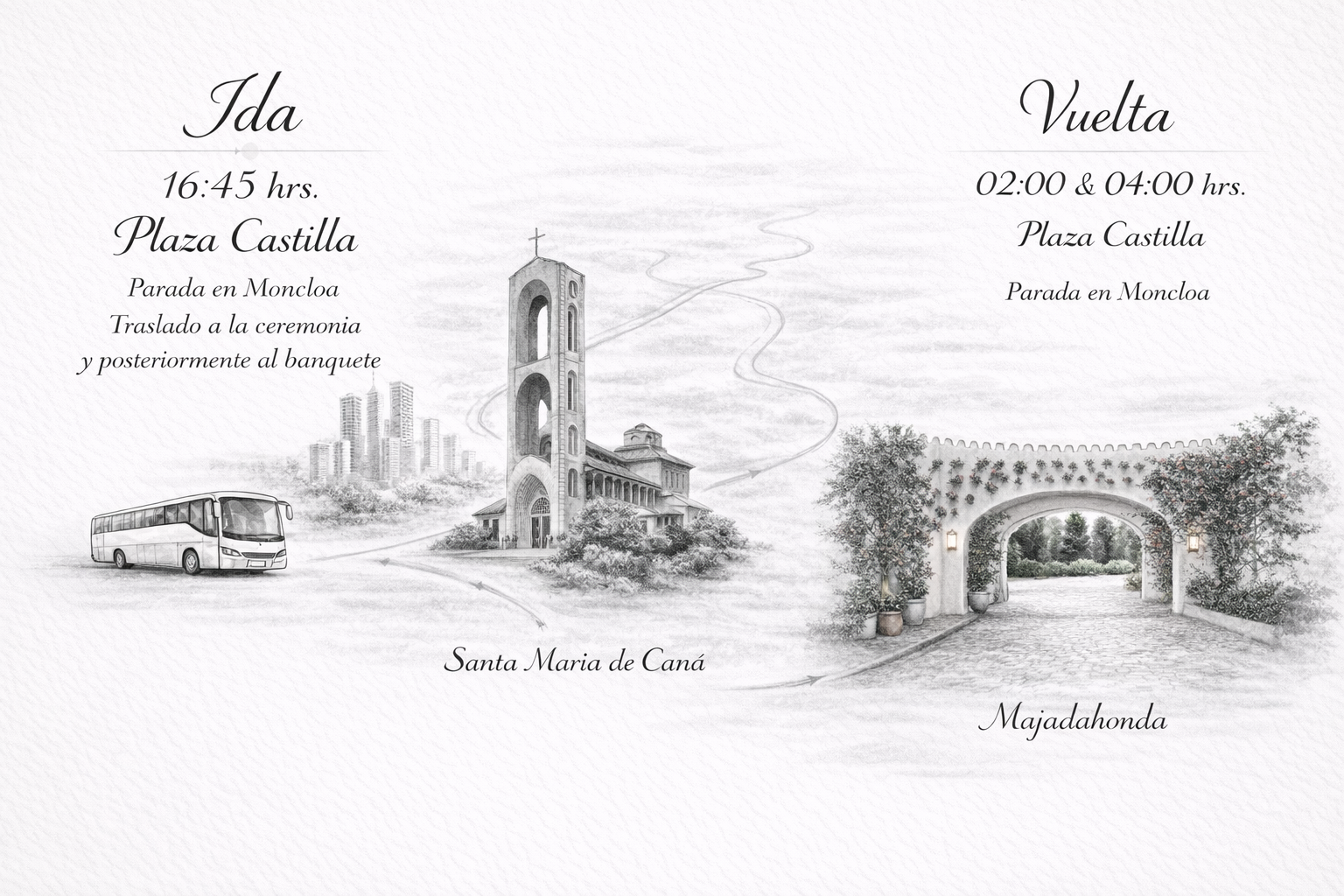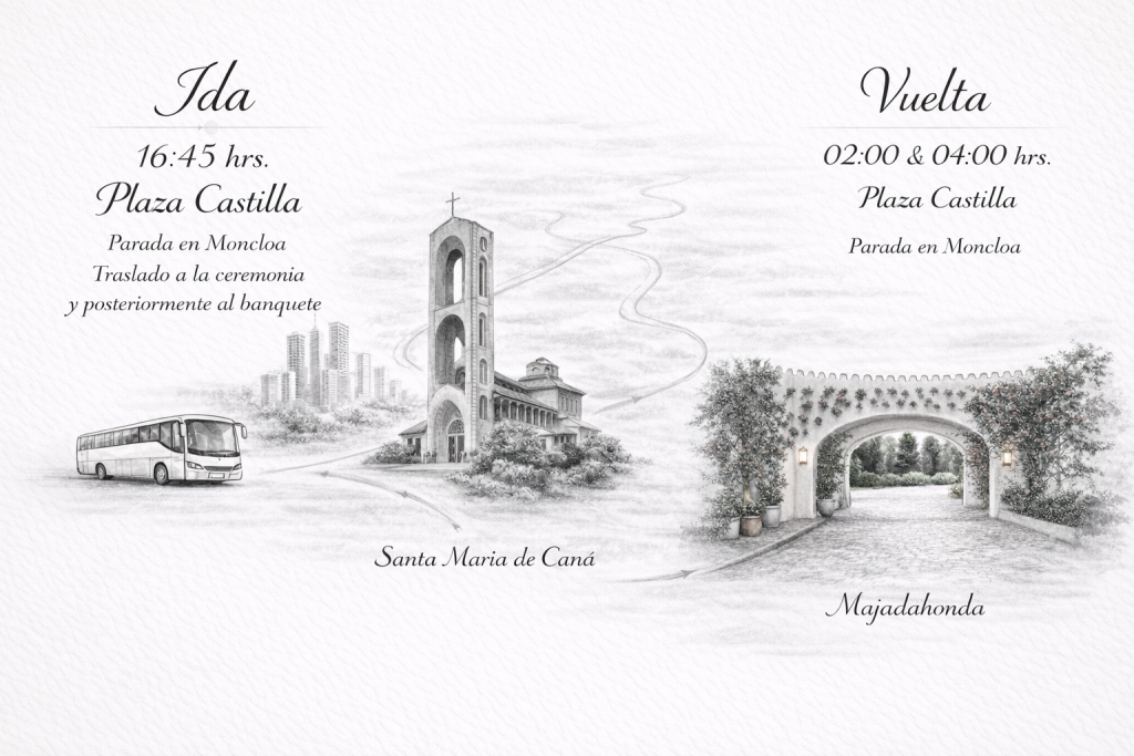 Hemos organizado un servicio de autobús privado que trasladará a los invitados desde Madrid centro hasta la iglesia y, una vez finalizada la ceremonia, al lugar del banquete.